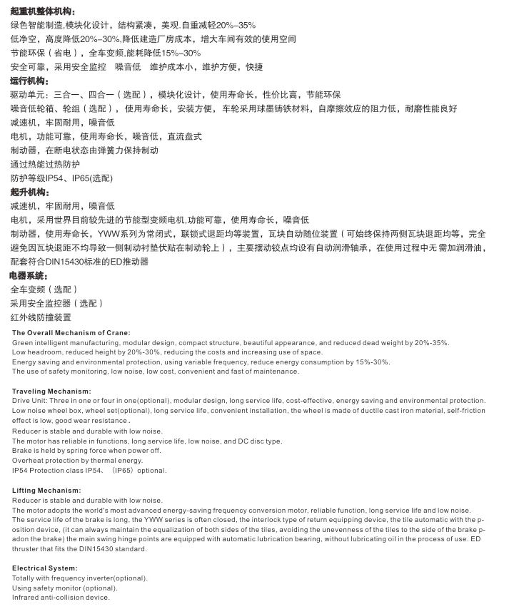 低噪音、免維護(hù)(降低檢修時(shí)間及維護(hù)成本低)(因結(jié)構(gòu)簡單,故配套件品種少,后期方便采購,同時(shí)也降低了庫存)。我公司的歐標(biāo)起重機(jī)通過變頻器調(diào)速,能有效減少用電量20%-30%,降低了使用成本,提高了使用效率。